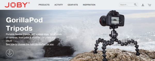 根據(jù)環(huán)境和使用場(chǎng)景來展示產(chǎn)品是電商網(wǎng)站常用的機(jī)巧。而實(shí)際的數(shù)據(jù)也表明,這樣的圖片擁有著極高的轉(zhuǎn)化率。舉個(gè)例子,下面所展示的 GorillaPod 就將產(chǎn)品置于實(shí)際的使用場(chǎng)景中,給予用戶真實(shí)的使用體驗(yàn)。靈活的三腳架在整個(gè)圖片中作為焦點(diǎn)而存在整個(gè)首圖的設(shè)計(jì)富有創(chuàng)造性,信息和內(nèi)容的傳遞也頗為高效。