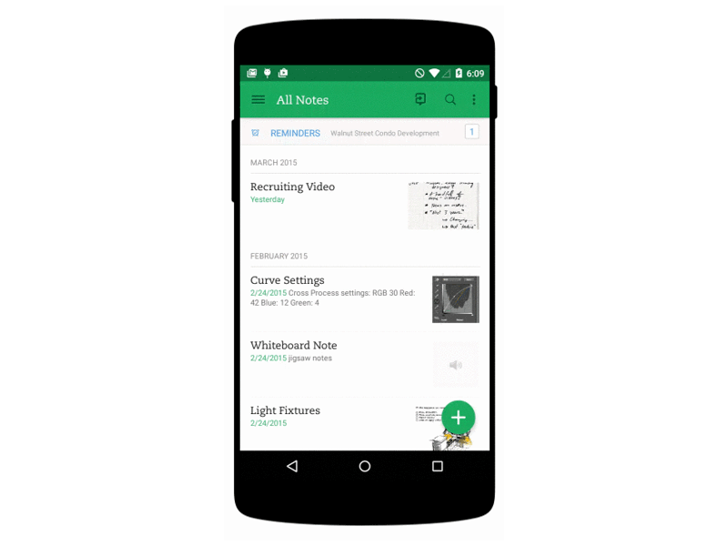 Evernote 的開發(fā)團(tuán)隊(duì)無疑是仔細(xì)考慮過移動(dòng)端的使用場(chǎng)景,所以充分利用了移動(dòng)端設(shè)備功能,讓用戶采用最快速有效的方法來保存想法(文本筆記,拍照,設(shè)置提醒)。