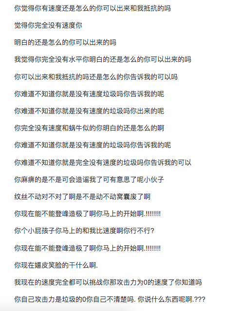 就拿扣字來(lái)說(shuō),其中的秘訣就是利用網(wǎng)絡(luò)的延遲,把事先打好的文字在聯(lián)網(wǎng)的那一刻全部發(fā)送出去,達(dá)到瞬間百字的效果,短句多對(duì)話框給人以氣勢(shì)之感。