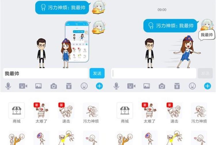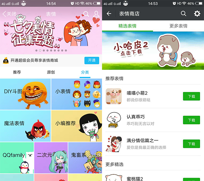 (QQ 表情和微信表情對(duì)比,左邊是 QQ 的表情商店,右邊是微信表情商店)