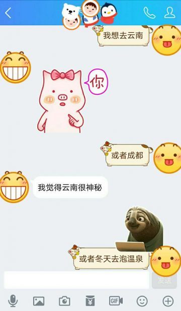 除此之外,QQ 的表情還可以貼到對(duì)話框上,顯示出來(lái)是下面這樣的。比單單發(fā)表情更多了一份生動(dòng),加上表情的純文字也讓整個(gè)對(duì)話框都活躍了幾分。