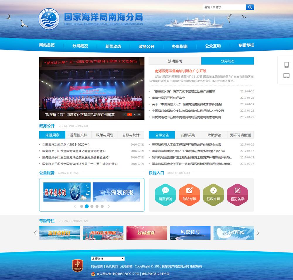 國家海洋南海分局成立于1965年3月18日,是國家海洋局設(shè)在廣州的南海區(qū)海洋行政管理機(jī)構(gòu)。南海海區(qū)現(xiàn)設(shè)有中國海監(jiān)南海總隊(duì)。分局擁有海洋水文、化學(xué)、地質(zhì)、氣象、生物、遙測浮標(biāo)、海洋計(jì)量檢定、海洋環(huán)境質(zhì)量評價(jià)、海洋信息服務(wù)等專業(yè)隊(duì)伍及先進(jìn)的儀器設(shè)備,擁有遍布兩廣沿海的觀測站網(wǎng)和遙測海洋環(huán)境數(shù)據(jù)浮標(biāo)網(wǎng)。有裝備比較先進(jìn)的“中國海監(jiān)”船、遠(yuǎn)洋考察船。